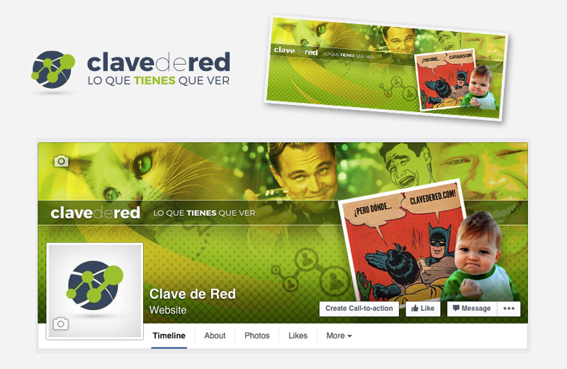 El logotipo y el cover de page de Facebook, con un detalle de como se ve en Facebook más abajo. Clave de red era un sitio con contenido viral, así que la idea era hacer algo divertido. El logo no es precisamente hilarante, pero me gusta como quedó el collage para FB, como un mini-compendio de memes.